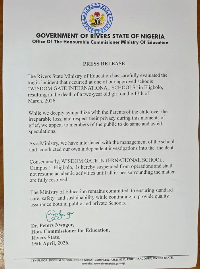 “The Rivers State Ministry of Education has carefully evaluated the tragic incident that occurred at one of our approved schools, Wisdom Gate International School, in Eligbolo, resulting in the death of a two-year-old girl on March 17, 2026,” the statement read.
