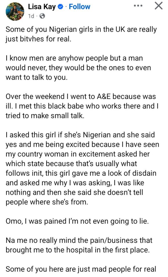 A Nigerian lady, Lisa Kay, has shared her experience of ‘rudeness and unfriendliness’ from a fellow Nigerian woman in the United Kingdom.