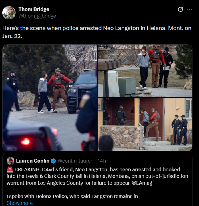 Neo Langston, a close friend of D4vd and a known streamer, was booked into a Montana jail on Thursday on a Los Angeles warrant for failure to appear as a witness, according to online records. A representative of the Lewis & Clark County Jail confirmed he is being held without bond due to the out-of-jurisdiction warrant.