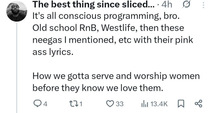 The X user added: “It’s all conscious programming, bro. Old school RnB, Westlife, then these neegas I mentioned, etc with their pink ass lyrics.