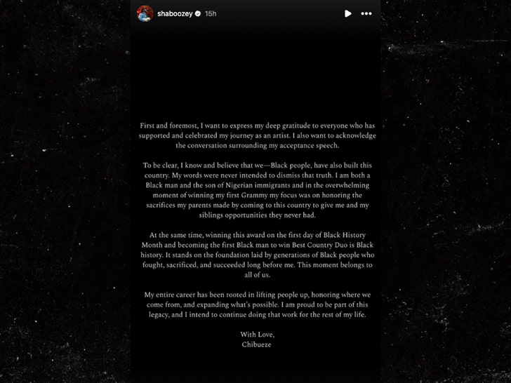 “I am both a Black man and the son of Nigerian immigrants and in the overwhelming moment of winning my first Grammy my focus was on honoring the sacrifices my parents made by coming to this country to give me and my siblings opportunities they never had.”