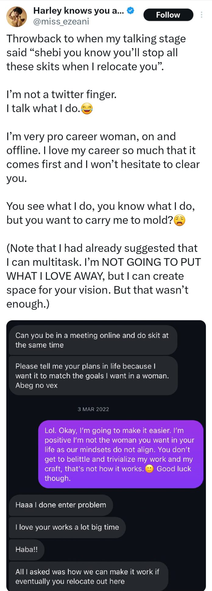 Miss Ezeani, a skitmaker who easily switches from acting like a woman to acting like a man, has revealed how she ended her relationship with a man who expected her to quit skitmaking to fit his idea of an ideal woman.