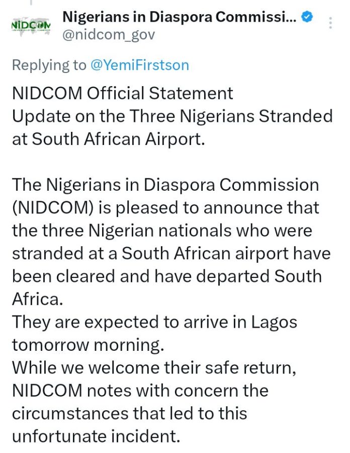 “The Nigerians in Diaspora Commission (NIDCOM) is pleased to announce that the three Nigerian nationals who were stranded at a South African airport have been cleared and have departed South Africa. They are expected to arrive in Lagos tomorrow morning,” the statement read.