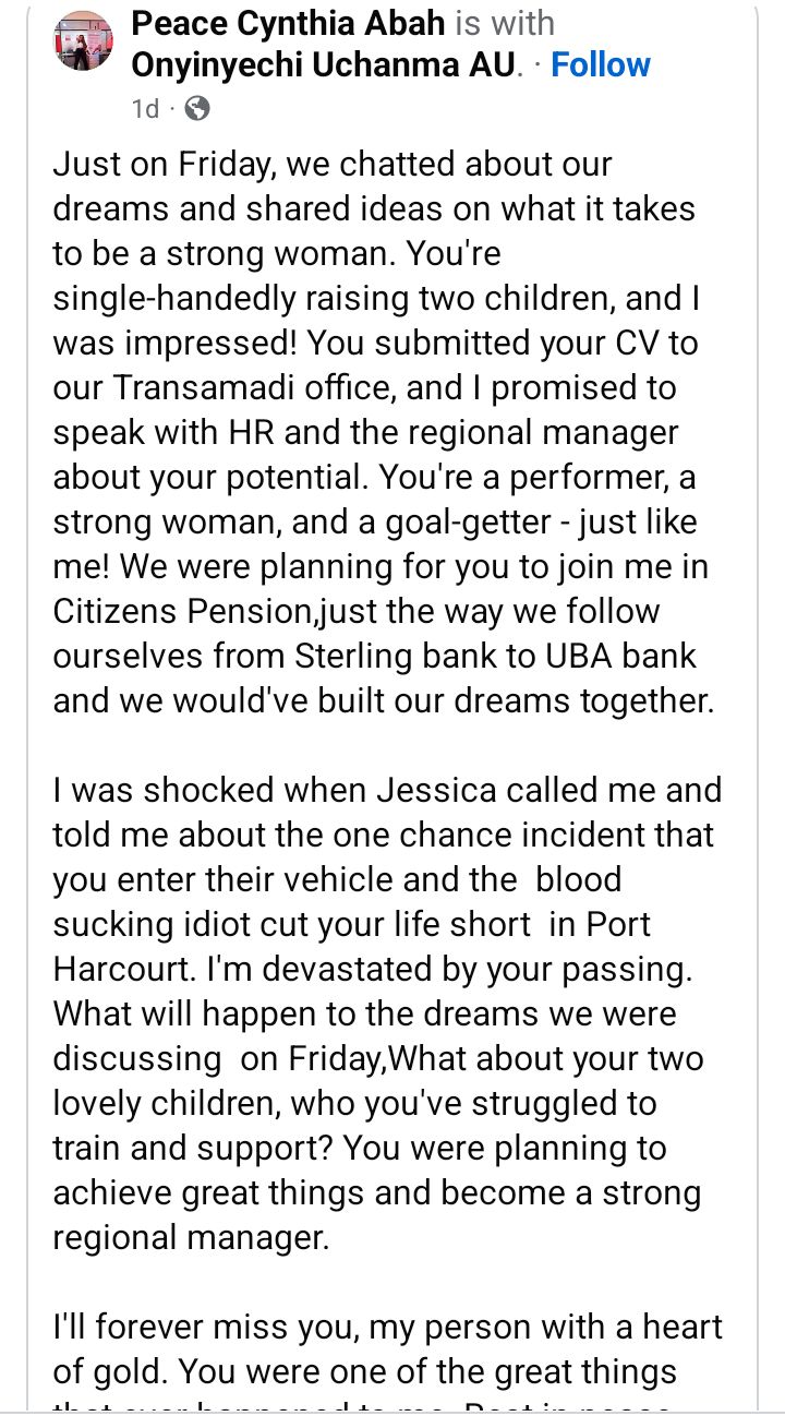 “I was shocked when Jessica called me and told me about the one chance incident that you enter their vehicle and the  blood sucking idiot cut your life short  in Port Harcourt.