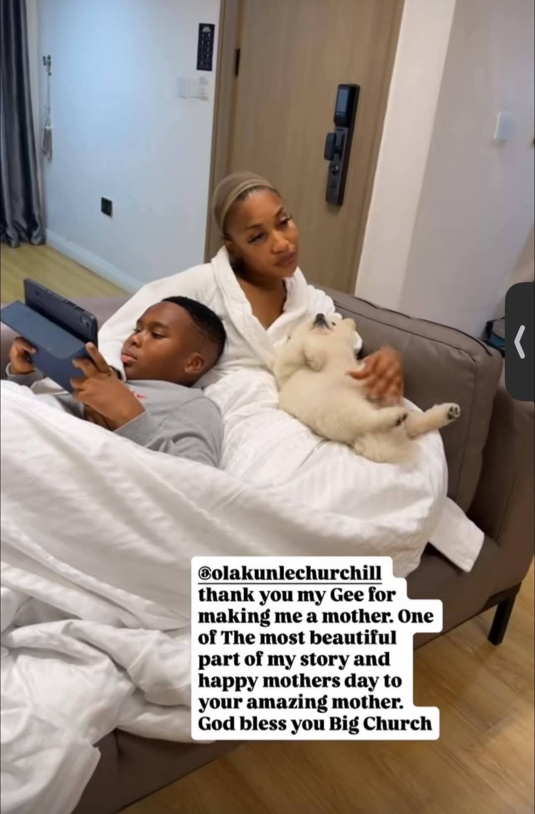 Tonto shared a video of her and her son King Andre relaxing at home with their dog and she wrote: “Churchill, thank you my Gee for making me a mother. One of the most beautiful part of my story and happy mothers day to your amazing mother. God bless you Big Church.”