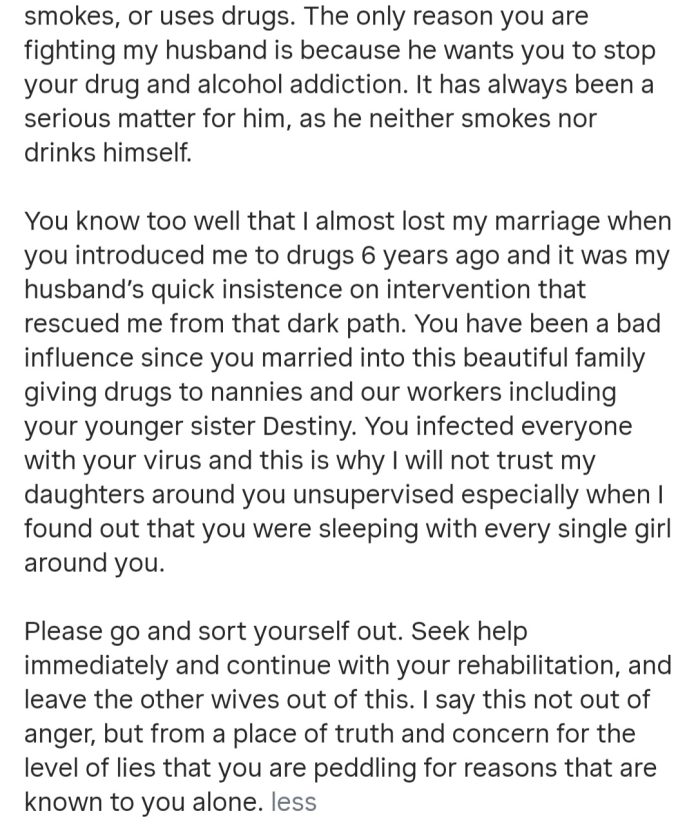 She then advised Regina to seek help immediately, continue with her rehabilitation and leave the other wives out of it.