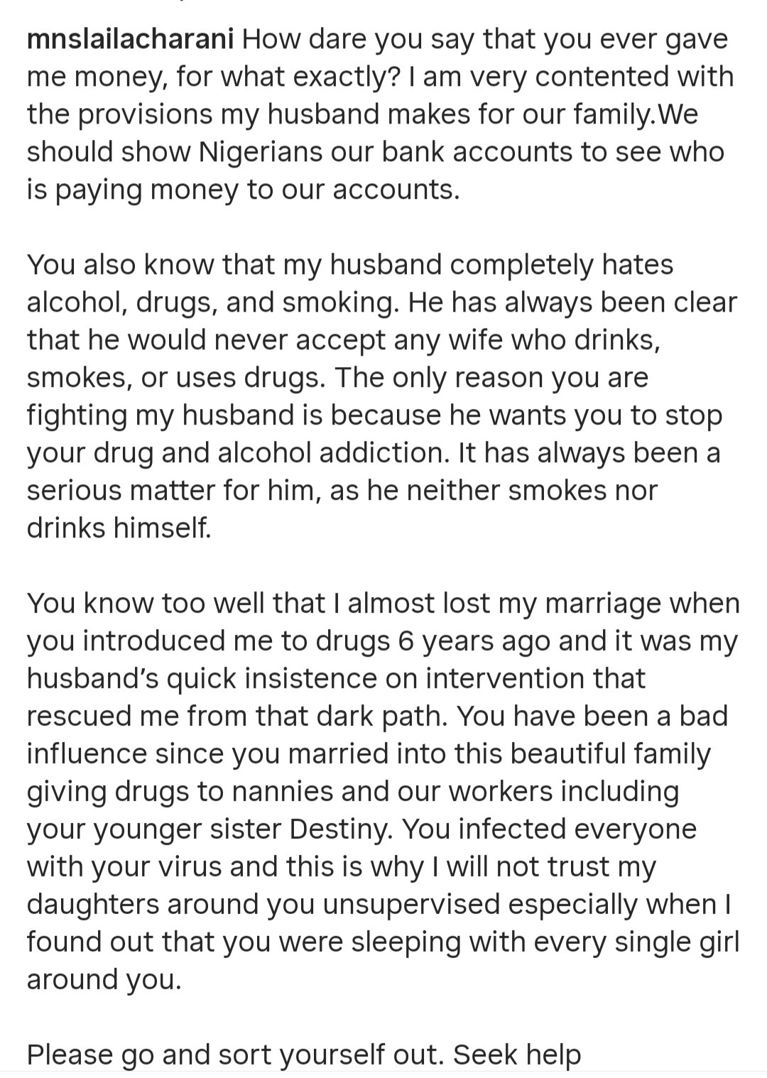 Laila also claimed the actress introduced her to drugs six years ago which made her almost lose her marriage to Ned. She claimed Regina introduced her nannies, their workers and her younger sister, Destiny, to drugs. She further stated that’sshe will never trust her daughters around Regina unsupervised because she found out Regina “sleeps with every single girl around her.”