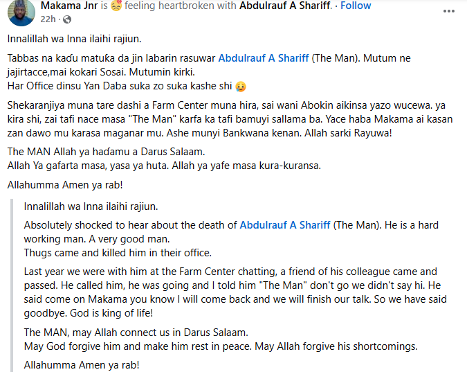 It was gathered that Shariff was st@bbed to d3ath by armed thugs while trying to prevent a criminal act.