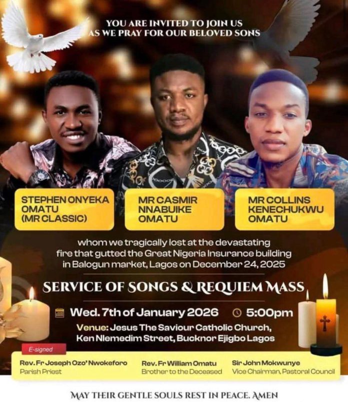 A family has announced the service of songs for three brothers who did when they were trapped in the fire the gutted the Great Nigeria Insurance House in Balogun, Lagos. The fire began on Wednesday, Dec. 24, trapping traders. Sadly, the fire also resulted in the collapse of a building which further trapped more people who were evacuating their goods to avoid loss. Three brothers Stephen Onyeka Omatu, Casmir Nnabuike Omatu, Collins Kenechukwu Omatu were sadly among those who did not make it out alive. Their service of songs holds tomorrow, Jan. 7, 2026. According to reports, the brothers are orphans. They leave behind two sisters and two brothers one a Catholic Priest.The post Tragic service of songs announcement for 3 brothers who did after being trapped in building during fire at Great Nigeria Insurance House appeared first on Linda Ikeji Blog.