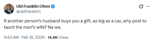 ‘’If another person’s husband buys you a gift, as big as a car, why post to taunt the man’s wife? Na wa.”