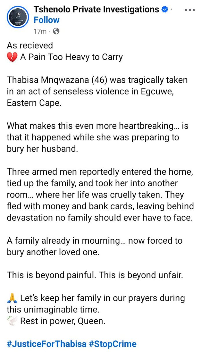 A 46-year-old woman, Thabisa Mnqwazana, was allegedly shot and k!lled by three suspected armed robbers in Egcuwe, Eastern Cape, South Africa.