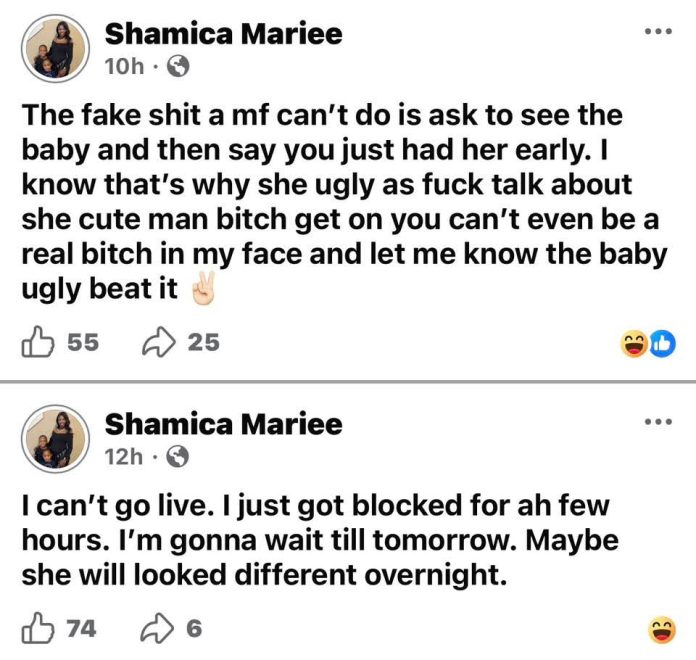 The mum, who goes by Shamica Mariee on Facebook, said she gave birth to “the ugliest baby I’ve ever seen”. She went on to insist her baby must have been switched at the hospital.