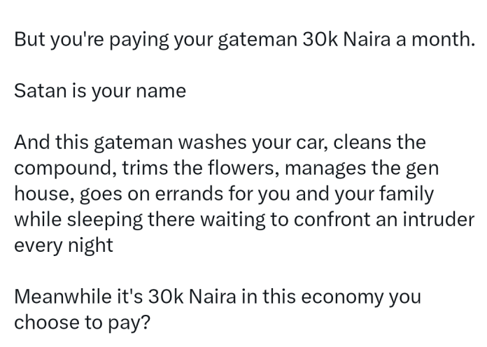 According to him, too many people in the city live in houses worth 100–200 million naira, drive powerful V8 engines, and send their children to schools costing over a million naira per term — yet still pay their gatemen just 30,000 naira monthly.
