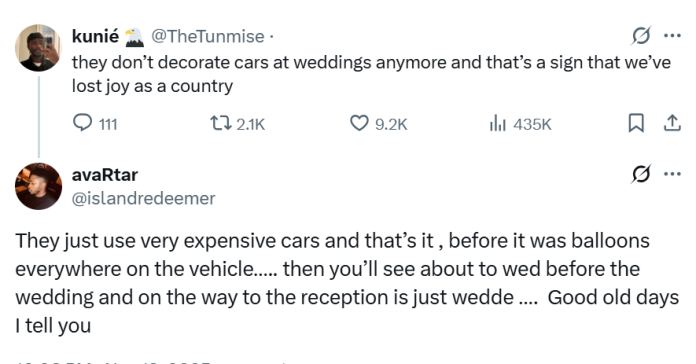 A conversation broke out on X after a user claimed that Nigerians no longer decorate cars at weddings, calling it a “sign that we’ve lost joy as a country.”