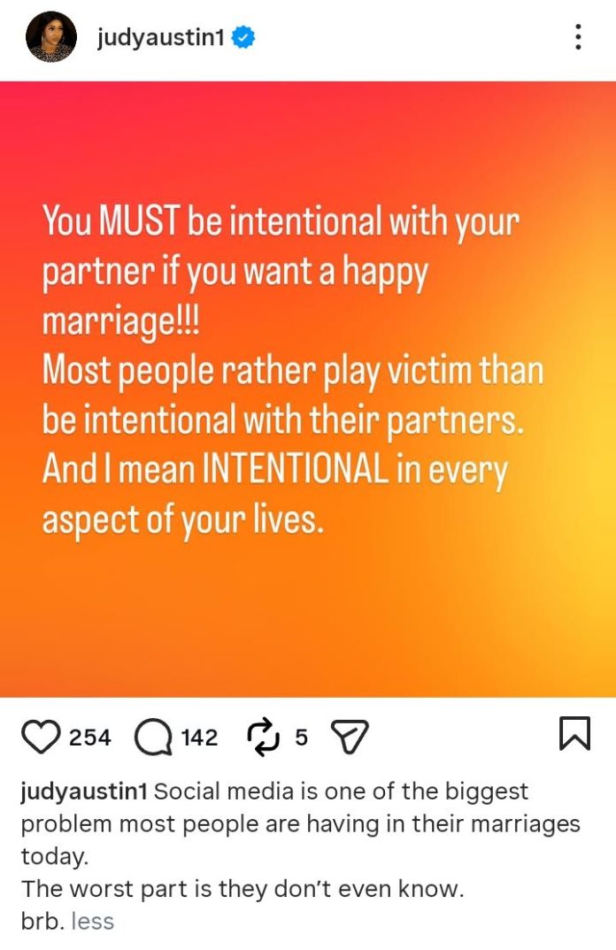 Nollywood actress, Judy Austin, has advised couples to be intentional with their partners if they desire a happy marriage.